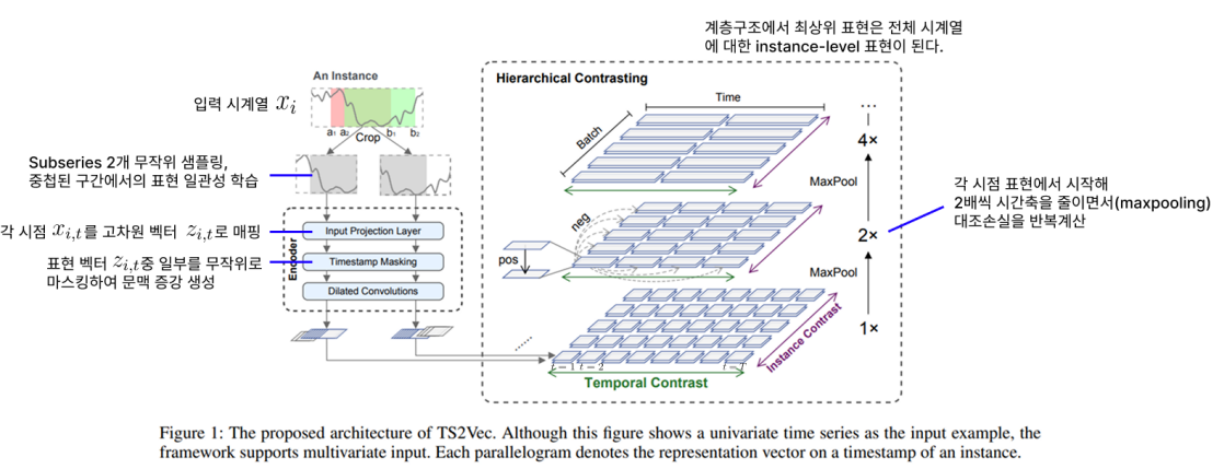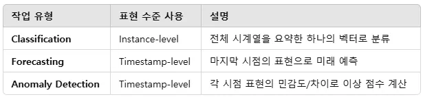 - But 인스턴스 수준의 표현은 시계열 예측(forecasting)이나 이상 탐지(anomaly detection)과 같은 미세한 수준(fine-grained)의 표현을 필요로 하는 작업에는 적합하지 않다. 이러한 작업에서는 특정 시점이나 특정 구간에 대한 정밀한 정보를 필요로 하며, 전체 시계열을 하나로 압축하 포현은 만족스러운 성능을 제공하기 어렵다.