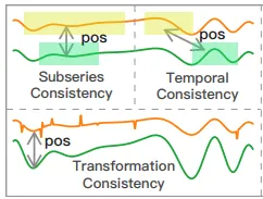 Random Cropping: 시계열에서 2개의 subseries를 무작위로 잘라내고 중첩된 구간의 표현이 일치하도록 학습