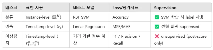 TS2Vec는 디코더 없이 인코더만 학습하고, 학습된 표현을 다양한 시계열 downstream 태스크 (분류, 예측, 이상 탐지)에 별도의 간단한 모델을 얹어서 테스트