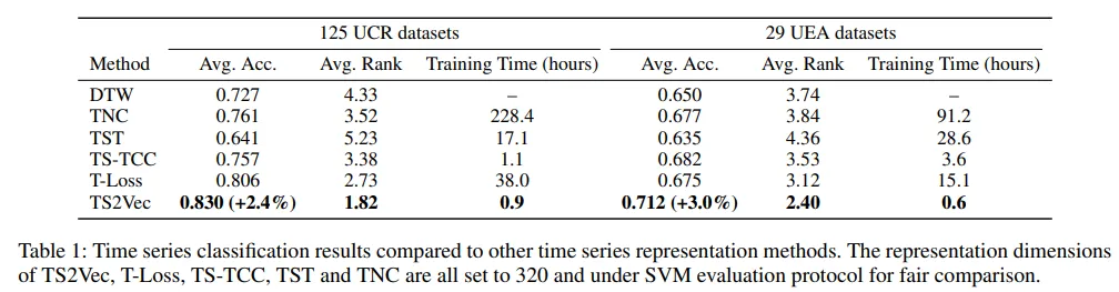 이후 T-Loss(2019)의 평가 방식에 따라 RBF 커널을 가진 SVM을 훈련하여 분류 성능을 측정