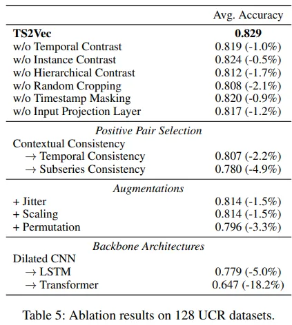 → TS2Vec의 핵심 기여 요소는 Contextual Consistency 기반 대조학습과 계층 구조임을 의미