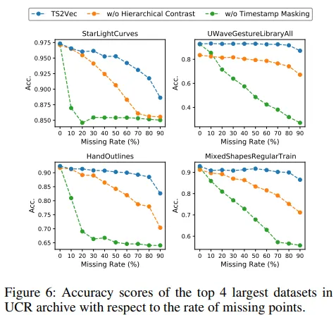 TS2Vec는 최대 50% 결측률까지도 안정적인 분류 성능 유지
