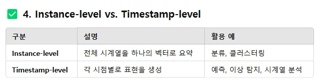 인스턴스 수준 표현 : 하나의 시계열 인스턴스(전체 시퀀스) 전체를 하나의 고정길이 벡터로 요약한 표현.