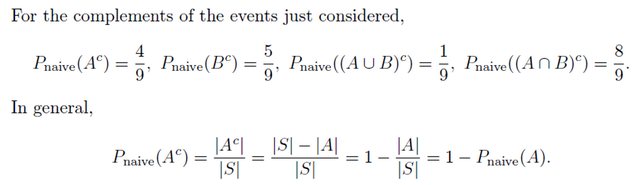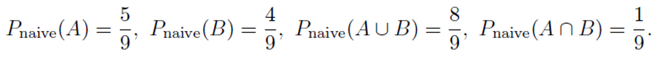 • The naive definition은 매우 제한적. S가 유한해야하며 각각의 pebble들의 질량이 동일해야 한다. 이것은 종종 잘못 적용되는데, justification 없이 그것이 50:50이라고 주장하는 것(예를 들어, 화성에 지적 생명체가 산다를 50:50이라고 함.)